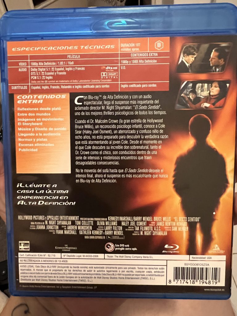 El sexto sentido pertenece a una época primeriza dentro del formato, su presentación es en una sencilla caja amaray aunque con una molesta pegatina que no pude quitar donde te indican que es compatible con la Play Station 3, por suerte esa costumbre ya no se usa en los Blu-rays actuales. los menús son sencillos y se divide en dos apartados, uno para acceder a la película directamente y en otro donde tenemos todas las características disponibles del Blu-ray,