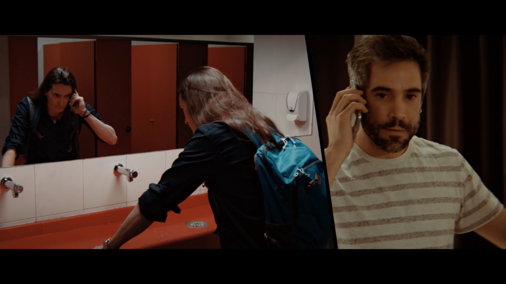 Esa escena fue improvisada y no había marcas, de hecho se iba a rodar en el centro comercial, pero por inconvenientes se tuvo que hacer en el lavabo y como no estaba coreografiado tuve mucha libertad. Una cosa curiosa es que las réplicas a la llamada estaban hechas… Pero por otro inconveniente solo salía una de las réplicas y entraba en bucle. No pasábamos del “Hola, junior” (poniendo voz de mafioso) yo contestaba a las frases que me tocaban pero en el teléfono siempre salía el “Hola, junior”… También me acuerdo de la escena de la nevera que era mucho más larga pero estaba más coreografiada porque había peligro con la actriz que por cierto era estupenda… Se ha cortado mucho