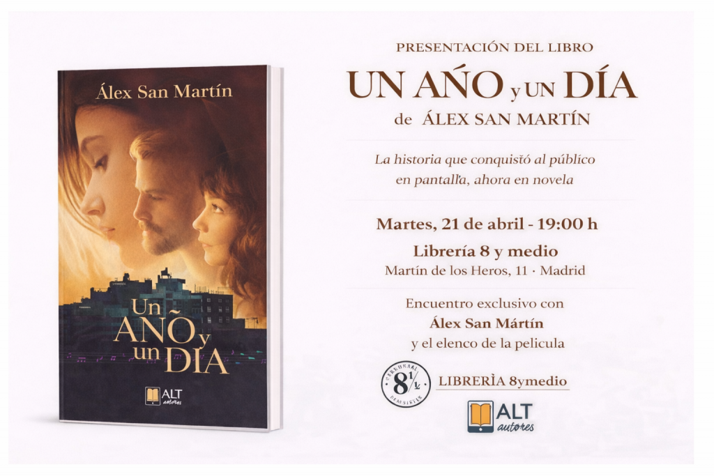 | Tras emocionar a miles de espectadores en cines y plataformas, además de consolidarse como una de las historias románticas más comentadas de los últimos años, ‘UN AÑO Y UN DÍA’ da un paso más en su recorrido creativo y SE CONVIERTE EN NOVELA. El director de cine Álex San Martín presenta ahora esta nueva versión literaria que profundiza en el universo emocional de la película y en la psicología de sus personajes. LA PRESENTACIÓN DE LA NOVELA ‘UN AÑO Y UN DÍA‘ tendrá lugar el próximo martes 21 de abril a las 19:00 h en la Librería Ocho y Medio (Madrid), en un encuentro muy especial que contará no solo con la presencia del autor, sino también con parte del elenco de la película. |